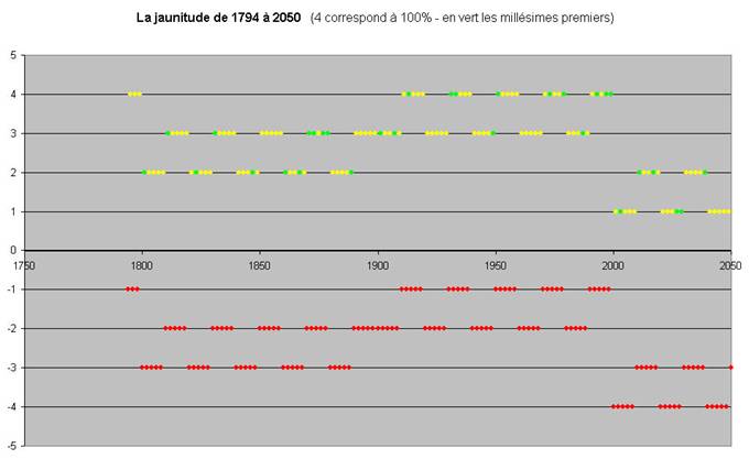 chiffres impairs dans la représentation décimale. Par exemple 2001 a une jaunitude de 25% seulement,